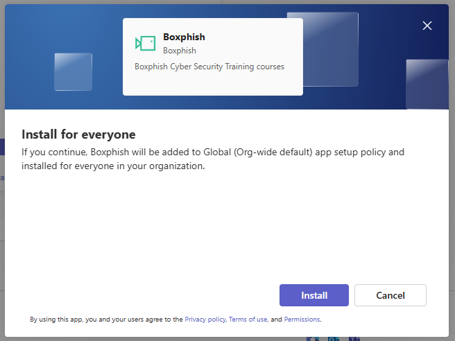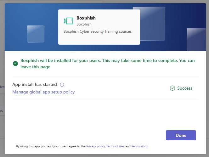 This guide walks you through installing the Boxphish app in your Microsoft Teams tenant and making it available to all users via the global setup policy.