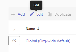 - Select the Global (Org-wide default) policy and click Edit. Note: You can create a custom policy instead if required, but this guide covers the Global policy.