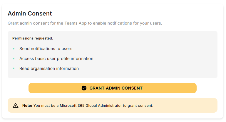 Granting admin consent allows the Teams app to send notifications and access basic organisation information.