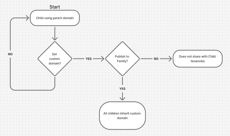 Custom domains only ever propagate downward. Domains are never shared upwards or between sibling tenancies.