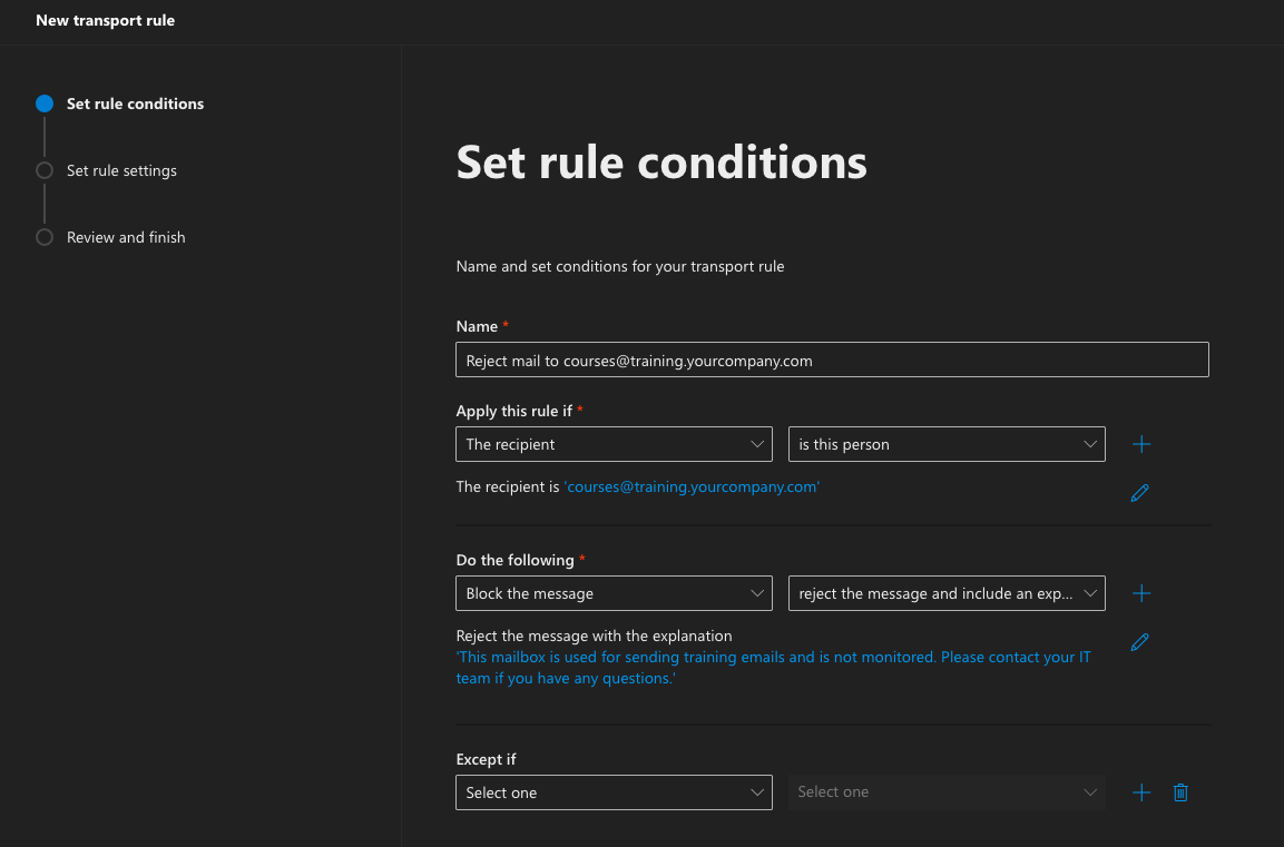 - Provide a Name: 'Reject mail to courses@training.yourcompany.com'