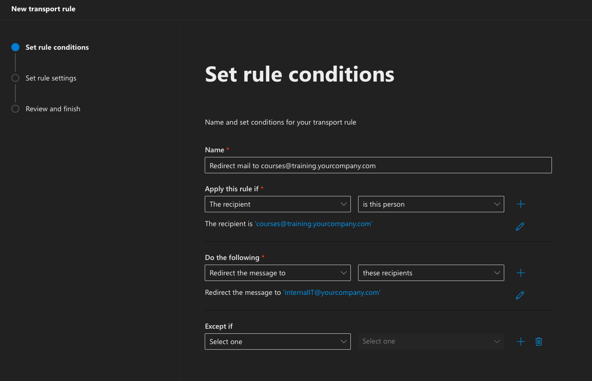 - Provide a Name: 'Redirect mail to courses@training.yourcompany.com'